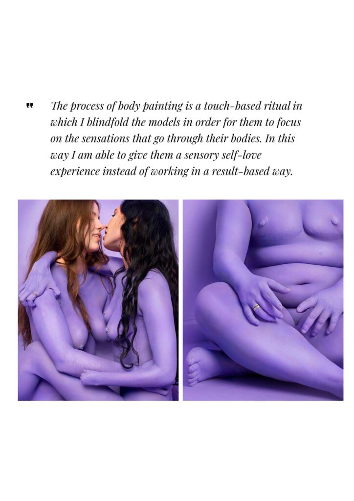 Through sensory experiences like body painting during a photoshoot, I guide participants in exploring self-love and connection. Blindfolded sessions encourage focus on the sensations of their bodies, transforming the process into an exercise of care and presence. - Participatory performances & exhibitions: